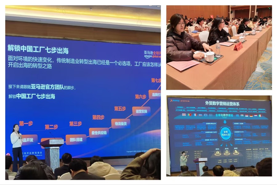 随后的主题活动宣讲环节,来自全球贸易通、亚马逊、杭州佳成国际物流等企业专家,围绕AI独立站搭建、工厂数字化转型、跨境物流解决方案等热点话题展开的深度解析;接着,“速卖通全托管模式”“中信银行跨境金融服务”的专题演讲;最后,江苏英佩尔国际贸易有限公司总经理虞波结合企业实战经验,分享的传统外贸转型的成功路径。