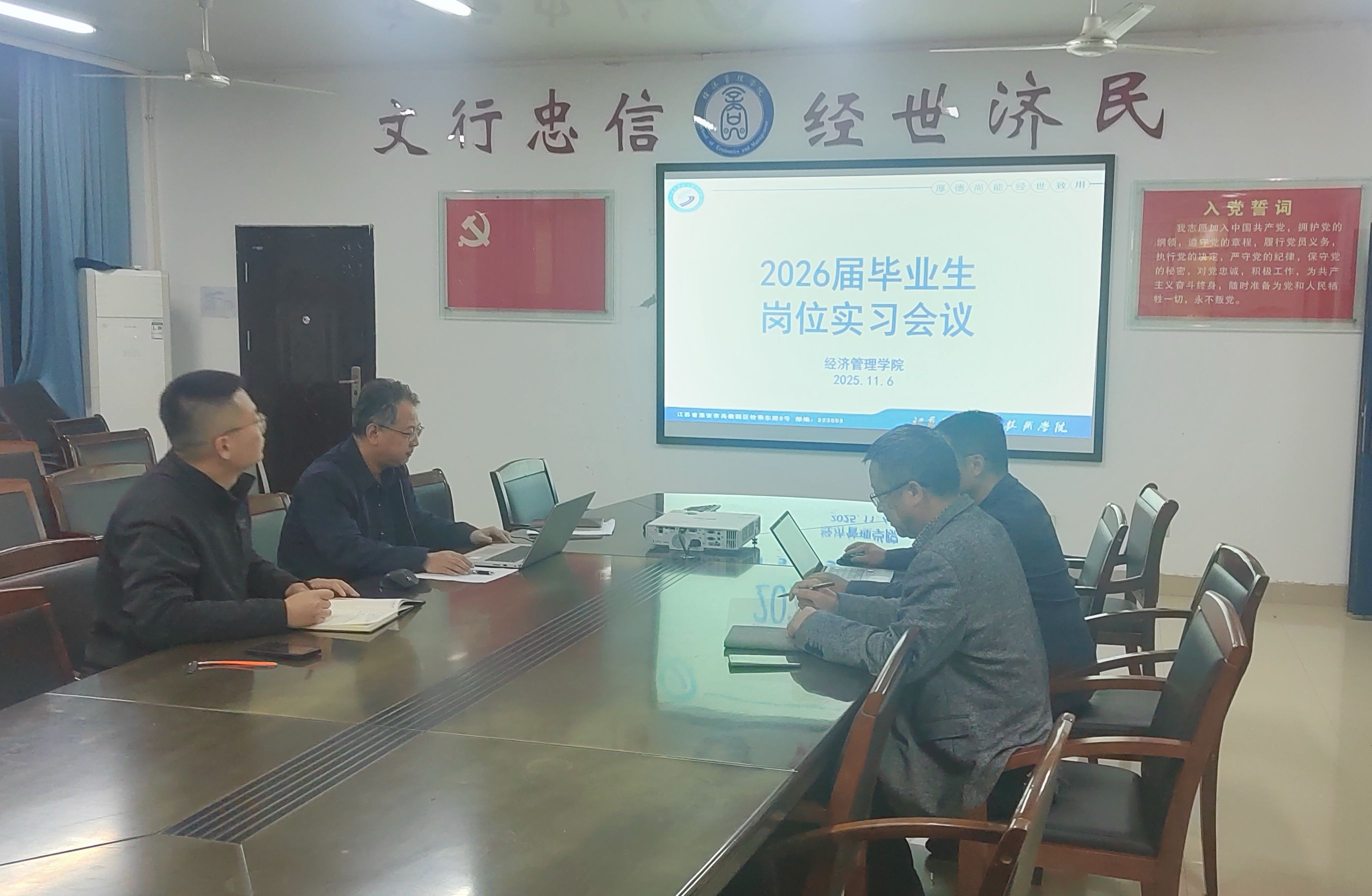 为扎实做好2026届毕业生岗位实习工作,引导学生明确实习任务、强化安全意识、把握优质实习机会,经济管理学院于2025年11月6日晚在笃行楼512会议室在线上召开2026届毕业生岗位实习会议。学院党总支书记卢海涛、副书记章尧东、副院长张海军、2026届毕业生指导老师、辅导员及全体学生参加了会议。会议由学院党总支书记卢海涛主持。