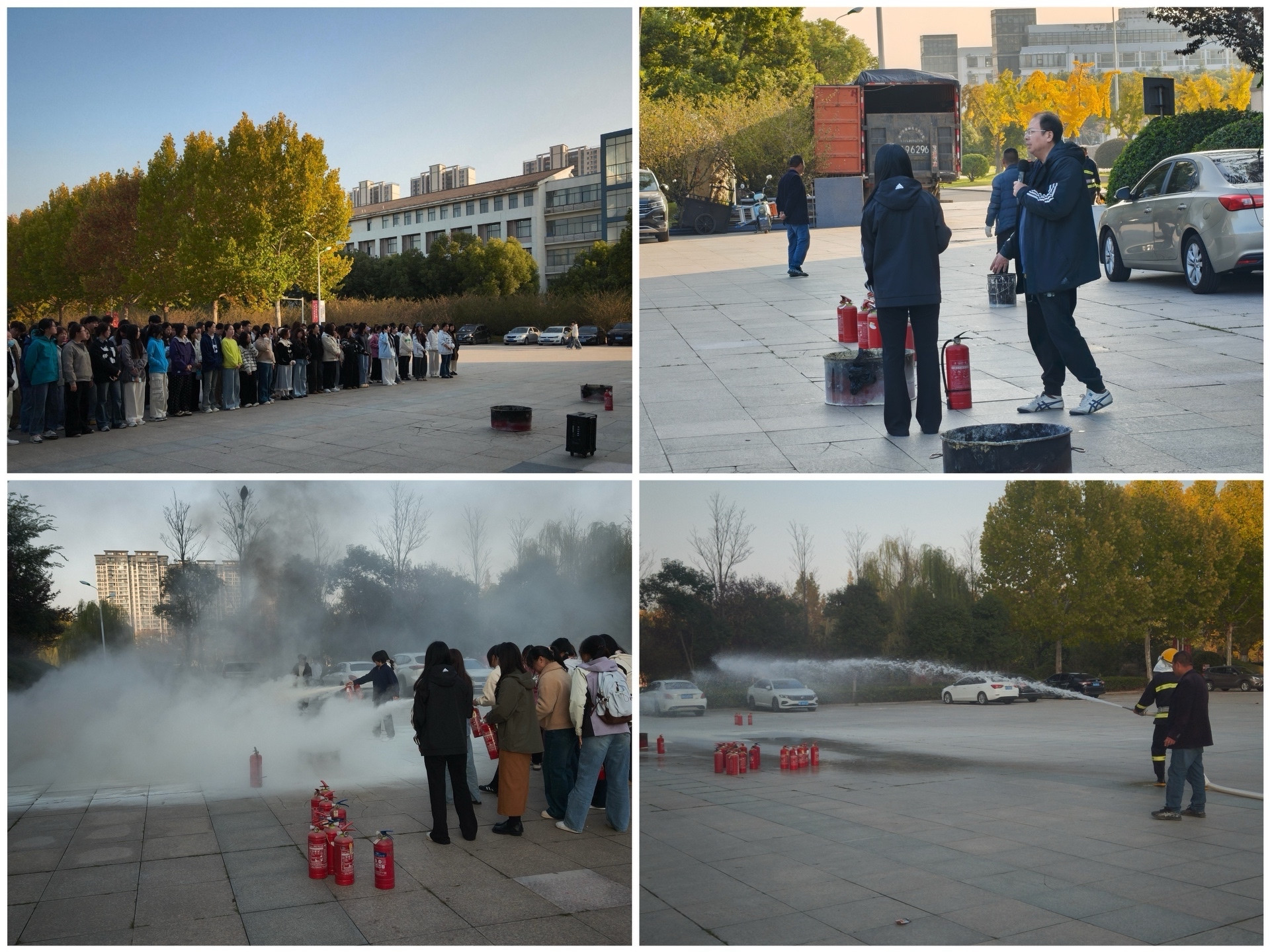 实操赋能,应急处置能力显著提升。疏散集结完成后,现场立即开展了灭火器实操教学环节。在保卫处专业人员的细致讲解与示范指导下,学生们踊跃参与灭火实践,亲手操作灭火器材,亲身体验初期火灾的扑救流程。这一环节将理论知识转化为实战技能,有效提升了学生在紧急情况下的心理承受能力与现场应对能力,真正实现了“学以致用、用以促安”的教学目标。
