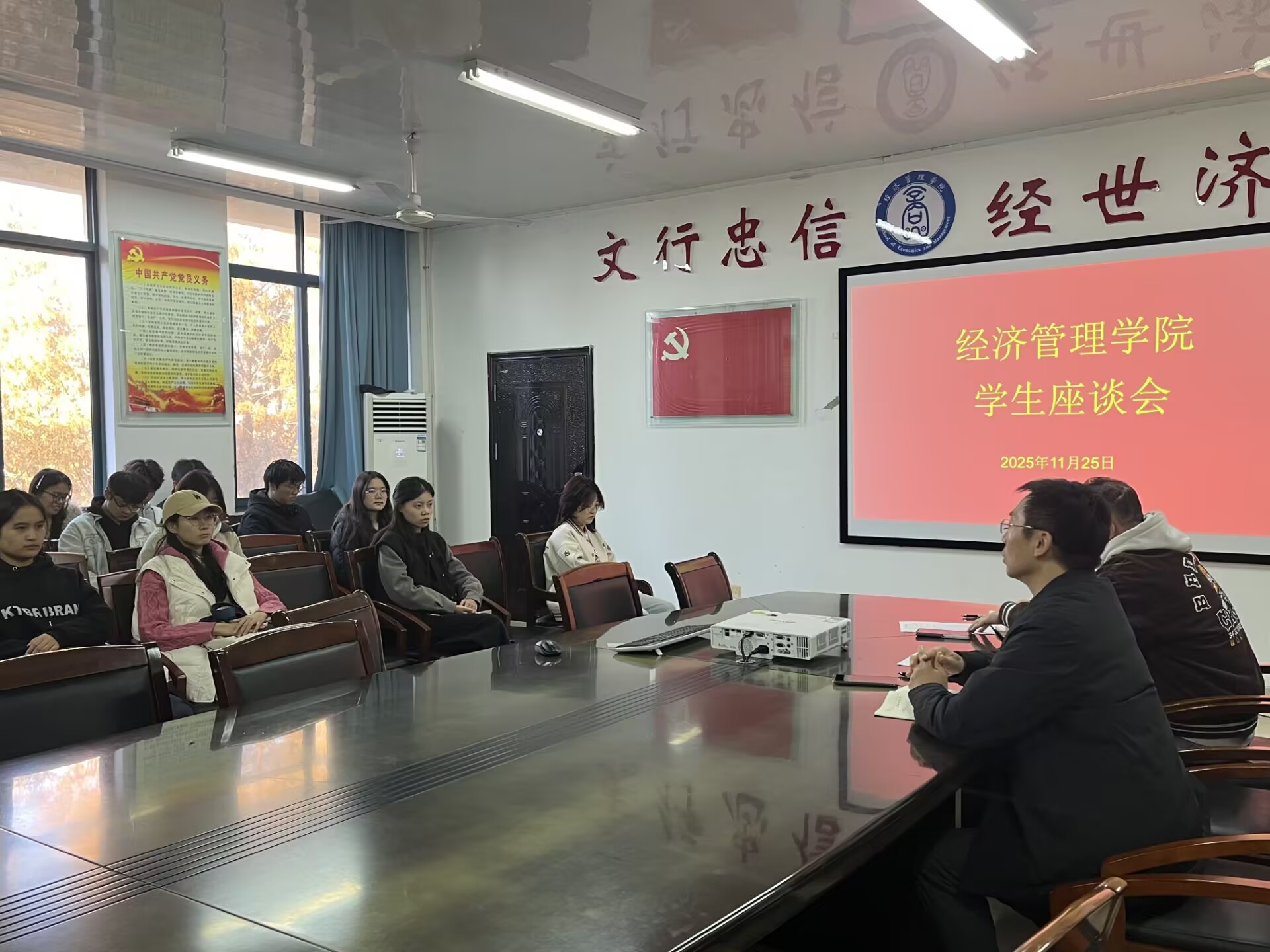 为了进一步提高经济管理学院学生服务工作水平,更好地了解学院教师的教学实施情况。11月25日下午,经济管理学院在笃行楼512会议室召开学生代表座谈会。参会人员为2024级、2025级各班级学生代表、经济管理学院副院长张海军、教学秘书闾沛辰,会议由张海军主持。